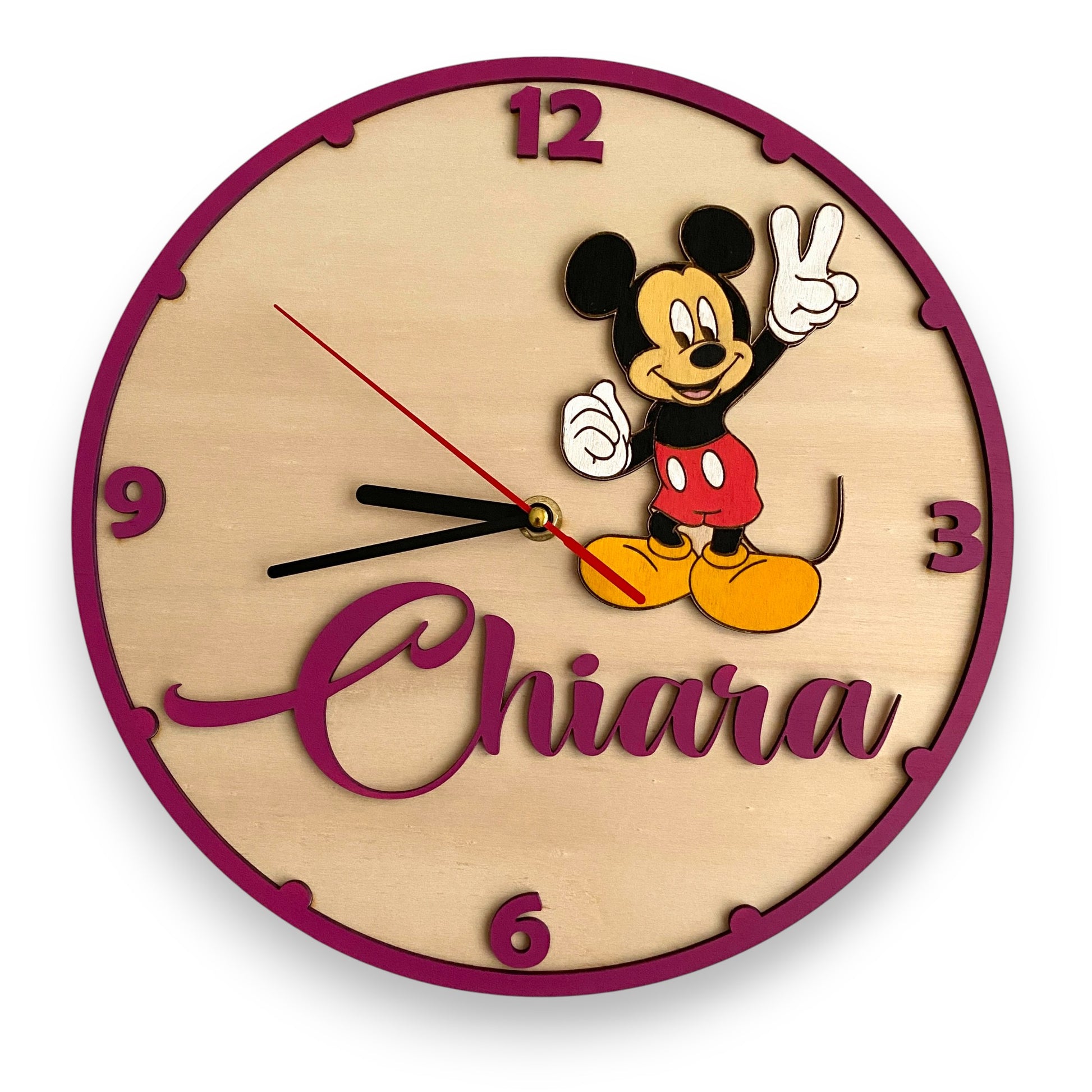 Porta un tocco unico e allegro alla tua casa con questo orologio da parete in legno inciso al laser. Con l'iconico Topolino, reso ancora più speciale dal nome personalizzato.